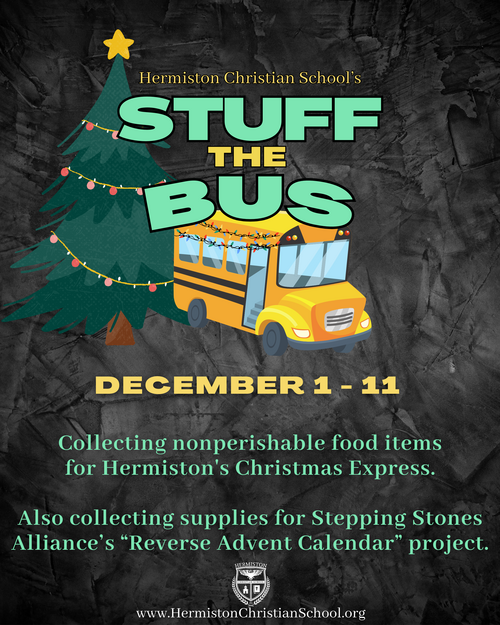 Your students may bring Food Drive and Stepping Stones items to their classroom from December 1-11. We will Stuff the Bus and deliver items on December 12th!